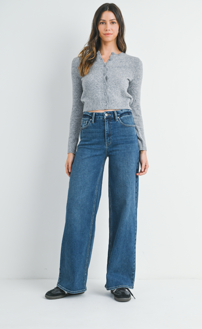 The High Rise Palazzo Wide Leg Jean brings maximum style with minimal effort. Featuring an 11" rise, 31.5" inseam, and a dramatic 12" opening, these dark denim beauties deliver a leg-lengthening silhouette that’s sleek at the waist and flowy through the leg. Made from a soft, stretchy blend, they’re comfortable enough for all-day wear while still making a bold fashion statement.