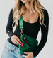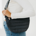 Our Jolie Puffer Crossbody Bum Bag is an updated version of the original fanny pack that can be worn in multiple ways. This quilted belt bag can be worn as a belt bag/fanny pack, crossbody bag, or shoulder bag. Featuring a unique half moon shape in a quilted puffer poly fabric. Gold hardware with a fun ribbon accent on the zipper finish off this popular design. This is one of our highest sell through designs and a must have for your boutique! We are obsessed with this style, it holds so much and the front zipper makes for really easy access to all of your necessities!