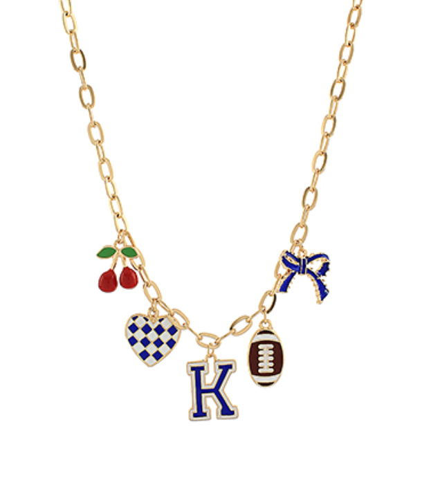 A playful mix of Wildcats pride and kitschy charm, this 16" necklace brings together cherries, bows, hearts, footballs, and the bold blue “K” to show off your school spirit with a wink. Style it with your game-day tee and jeans, or layer it with dainty gold chains to make your team pride look effortlessly chic.
