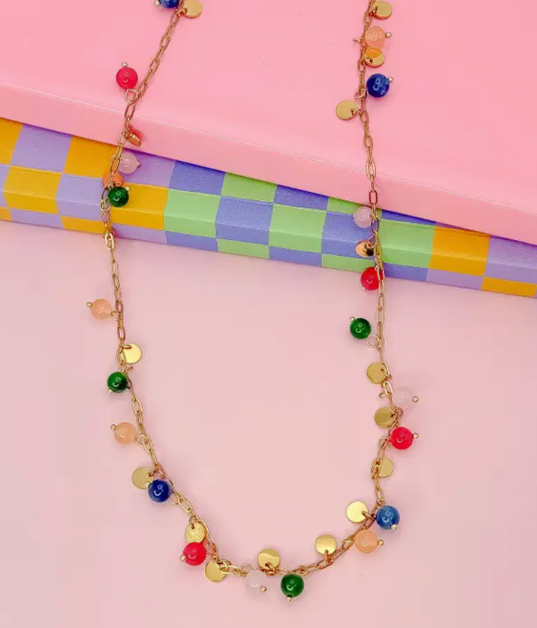 Turn every sidewalk into a runway with the Life’s a Party Necklace! Playful and full of movement, this 34" stunner features a dainty gold chain sprinkled with vibrant beads and shiny gold discs that catch the light with every step. Finished with a clear protective coat to keep colors bright and bold, this one’s made to move—and made to last—with a 2" extender for extra layering fun.