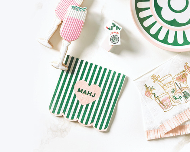 Add a playful pop to your mahjong table with these Mahj Love Napkins. Featuring bold green stripes and a sweet heart-forward design, they’re the perfect finishing touch for mahj nights, cocktails, and light bites with friends. Fun, festive, and easy to mix into your entertaining lineup.