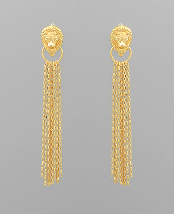Command attention with the Majestic Mane Earrings. Featuring a regal lion head design with cascading gold chain tassels, these 2.75" earrings bring bold movement and undeniable presence. The intricate detailing and luxe finish make them a true statement piece that balances strength and elegance.