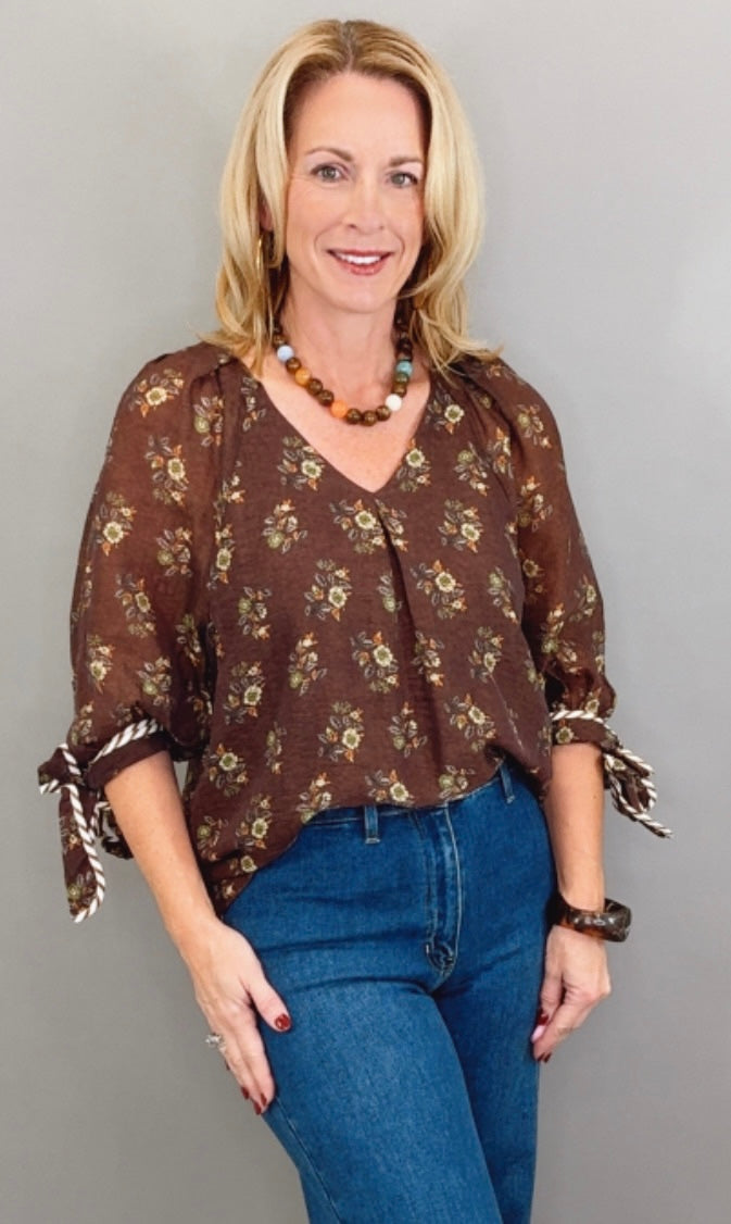 Romantic and effortlessly charming, The Maple Lane Top is a fall favorite with vintage-inspired florals and playful bow-tie sleeves. Its lightweight textured fabric drapes beautifully, while the relaxed V-neckline and subtle shoulder gathers add a touch of softness. The ties at the cuffs bring a feminine finish that feels both classic and current.