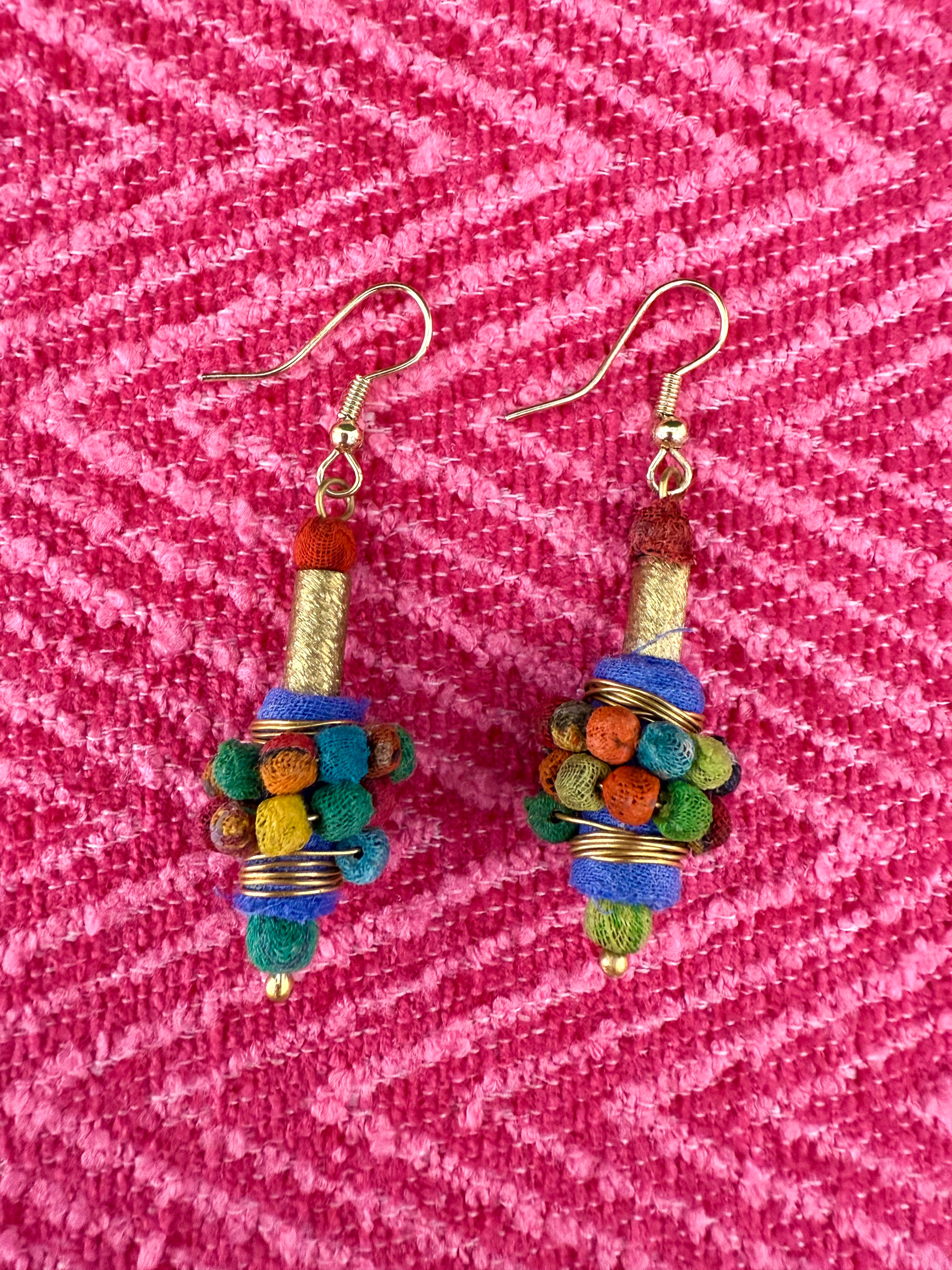 Intricate hand-wrapped cotton beads & brass wire earrings