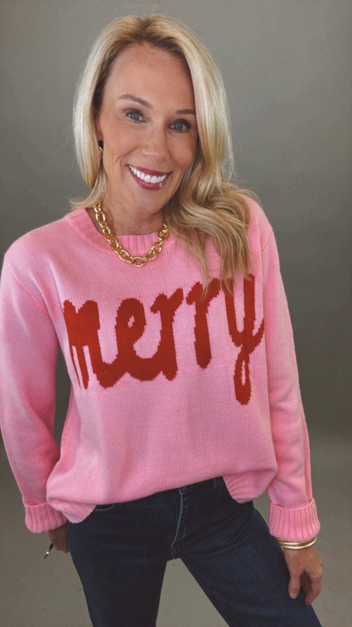 Add a pop of joy to your winter wardrobe with the Merry & Bright Sweater. Designed in a playful pink knit with bold red lettering, this cheerful pullover captures the spirit of the season in cozy, statement-making style. The relaxed fit, soft knit texture, and ribbed trim make it as comfortable as it is festive — perfect for holiday parties, cookie swaps, or cozy nights in.