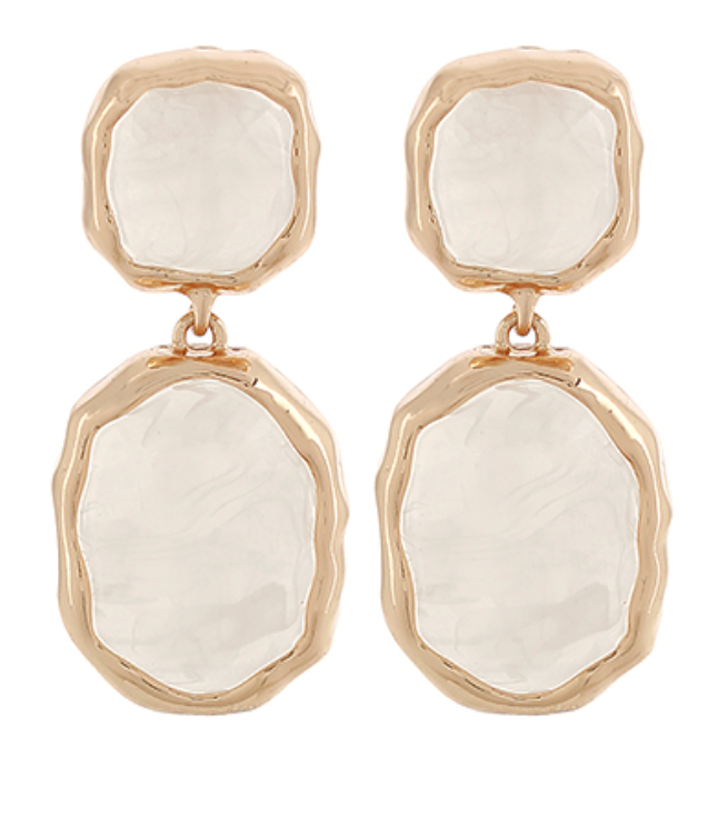 A bold, sculptural statement that blends clean lines with organic elegance. The Modern Muse Gem Drop features a double-tier design framed in molten-gold edging, each stone offering a soft, marbled glow that feels both contemporary and timeless. Lightweight yet luxe, this pair instantly elevates any look—from everyday chic to holiday glam. Available in clear, tortoise, and emerald for three distinct moods.