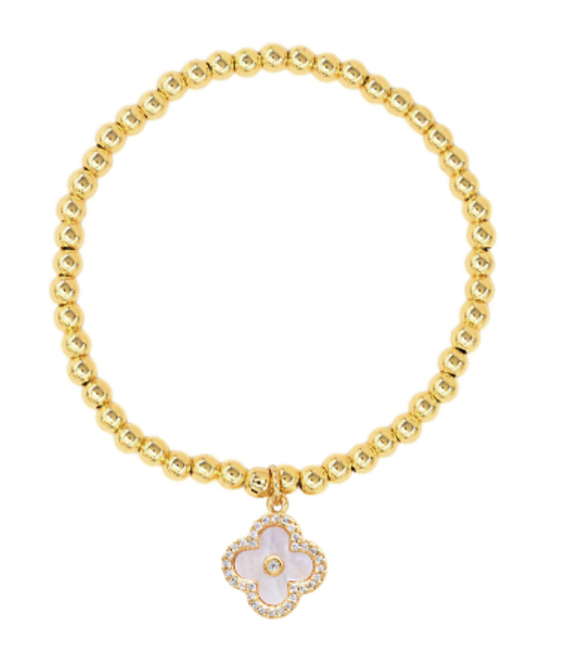 A dreamy touch of elegance, the Moonlit Clover Bracelet features high-shine gold beading and a delicate mother of pearl clover charm framed in shimmering crystals. Water-resistant and effortlessly chic, it’s your lucky little luxury for everyday wear or evening shine.