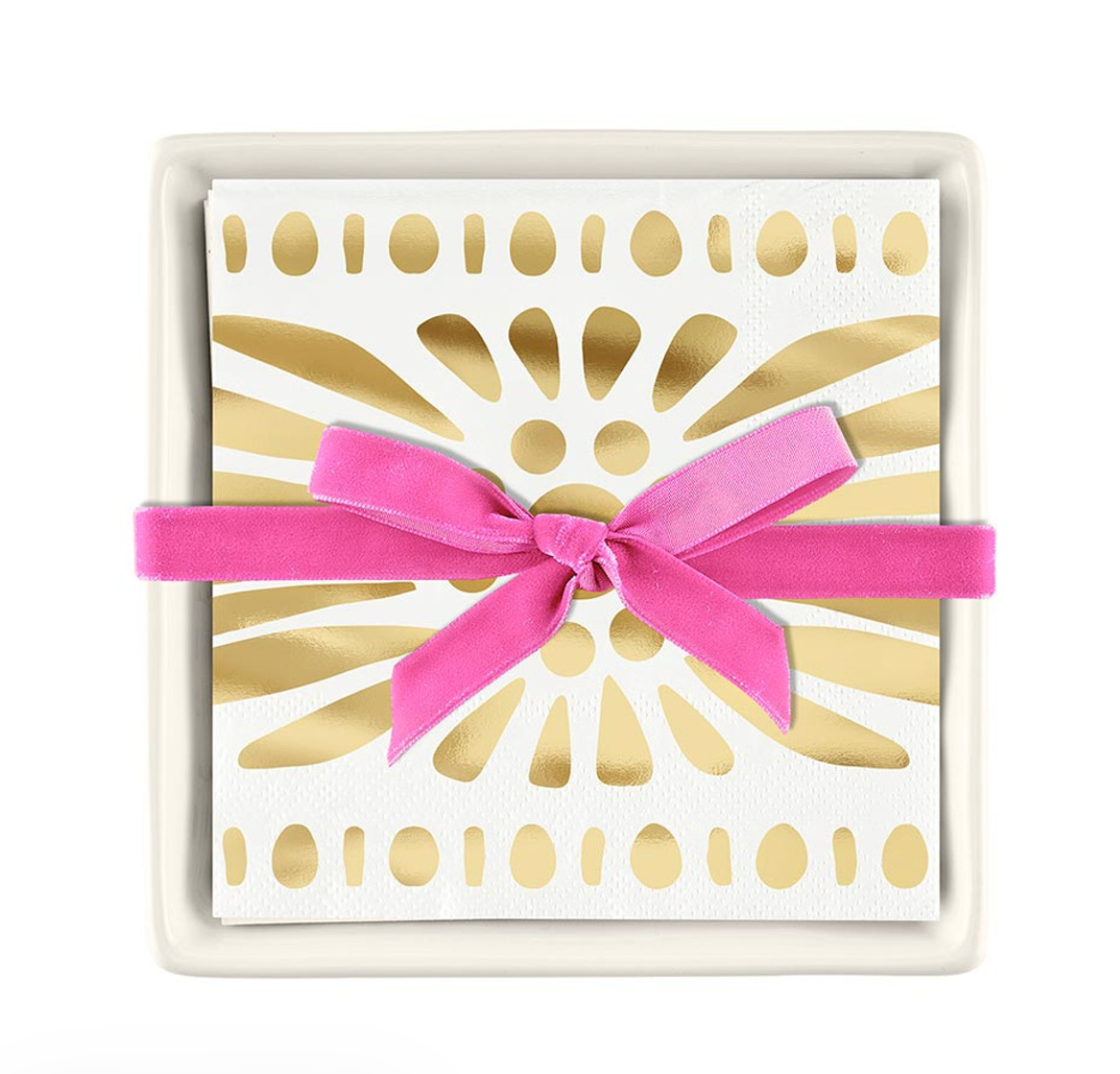 This ceramic napkin tray with paper cocktail napkins is a stylish and practical accessory for organizing and presenting napkins during social gatherings or special occasions. Has a touch of velvet to elevate the look!