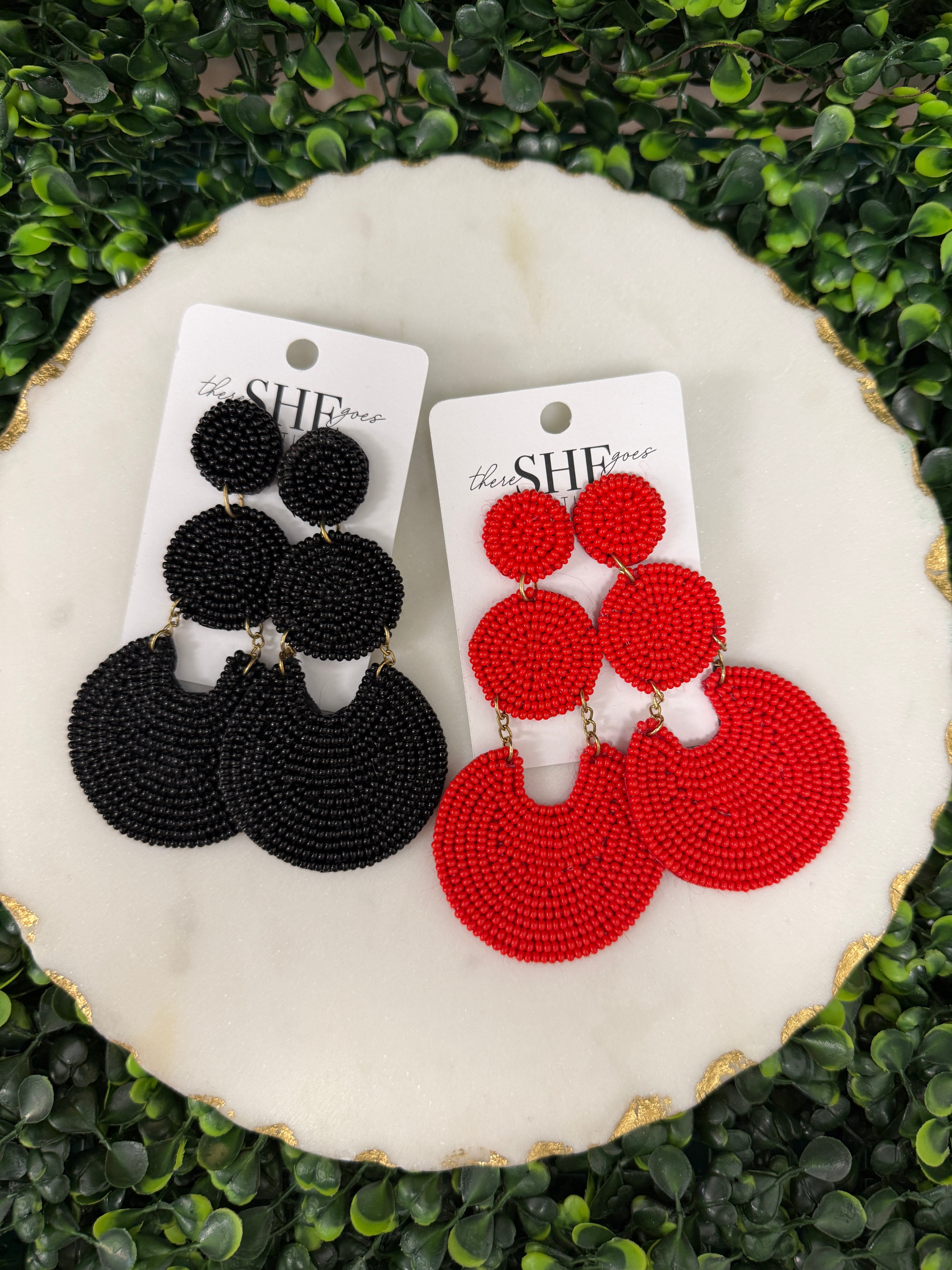 Make an entrance with these bold 3.5" tiered beaded statement earrings. Designed with three cascading circles made from tiny seed beads, they bring texture, movement, and a fun pop of color to any look. Choose vibrant holiday red for a festive touch or classic black for a chic, timeless vibe. Lightweight yet full of impact, they’re the perfect accessory for parties, celebrations, and standout moments all season long.