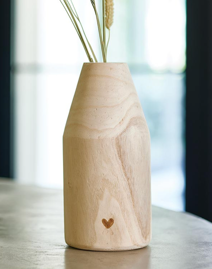 Add a touch of natural charm to your home with the Paulownia Heart Vase. Handcrafted from lightweight, sustainable paulownia wood, this vase features a smooth organic finish and a sweet carved heart detail at the base. Its minimalist silhouette pairs beautifully with fresh blooms, dried stems, or can stand alone as a statement piece. Perfect for creating a cozy, heart-filled space.