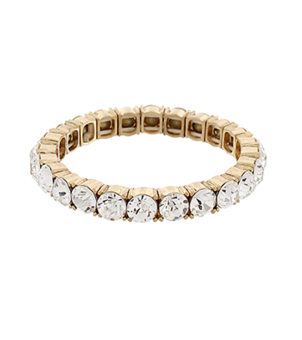 Cue the sparkle—this stretch bracelet is all glam, no fuss. With a band of brilliant crystal rhinestones set in brushed gold links, it’s the kind of piece that turns every wrist flick into a shimmer moment. Elegant enough for evening, playful enough for every day.