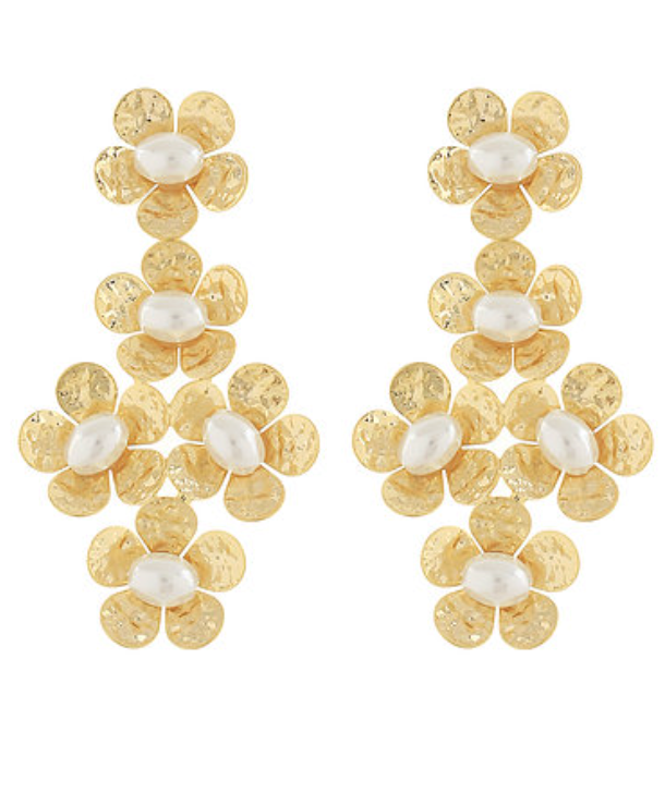 The Petal Parade Drops feature cascading hammered gold flowers with soft pearl centers for a bold yet romantic 2.25" silhouette. The textured gold catches the light beautifully while the pearl accents add a timeless touch.