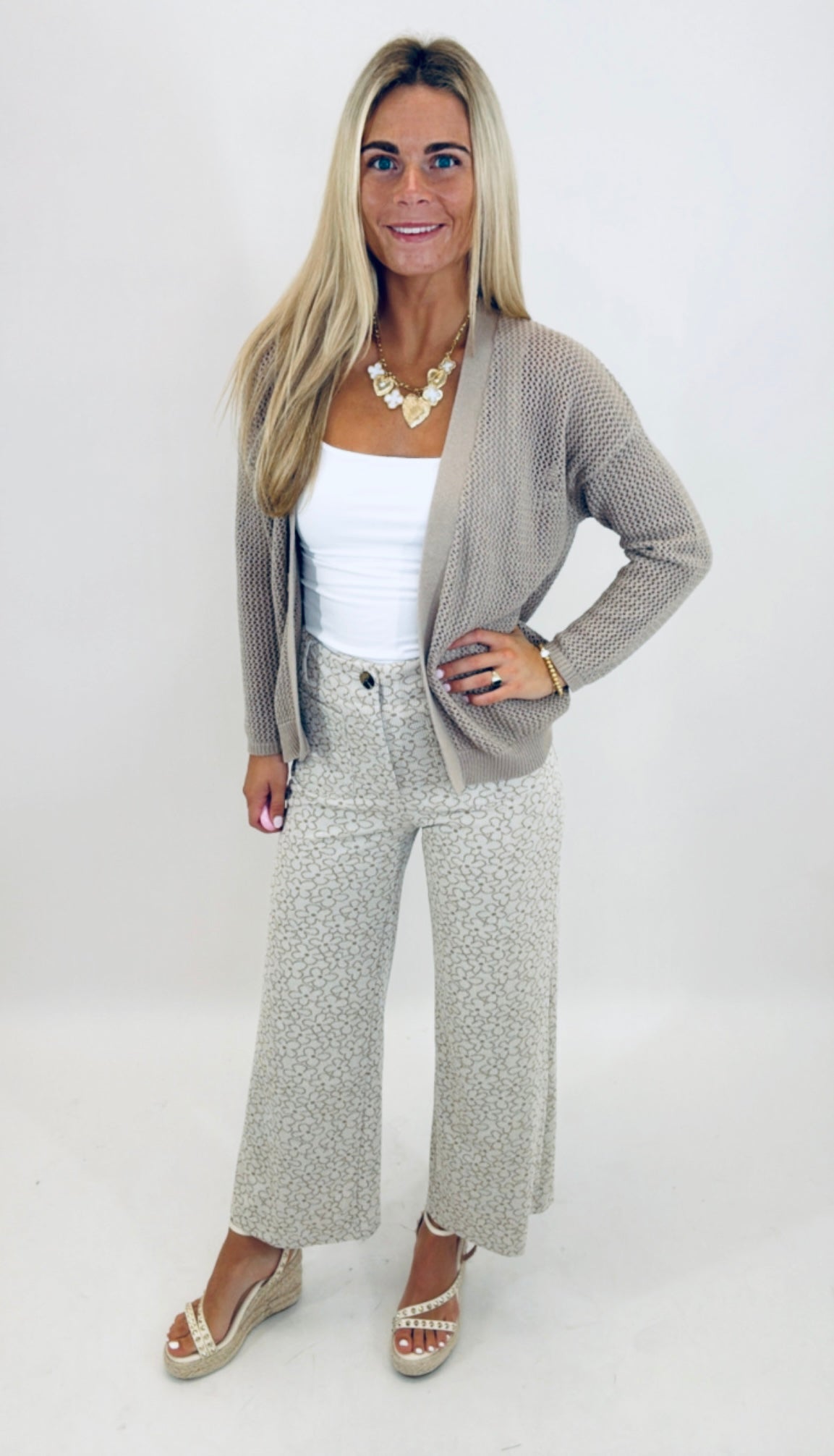 A subtle floral moment meets laid-back tailoring in these wide-leg crop pants. Designed in a soft taupe with a delicate, low-profile flower print, they bring just the right amount of whimsy to your everyday style. The breezy silhouette and cropped length make them a warm-weather staple with year-round versatility.