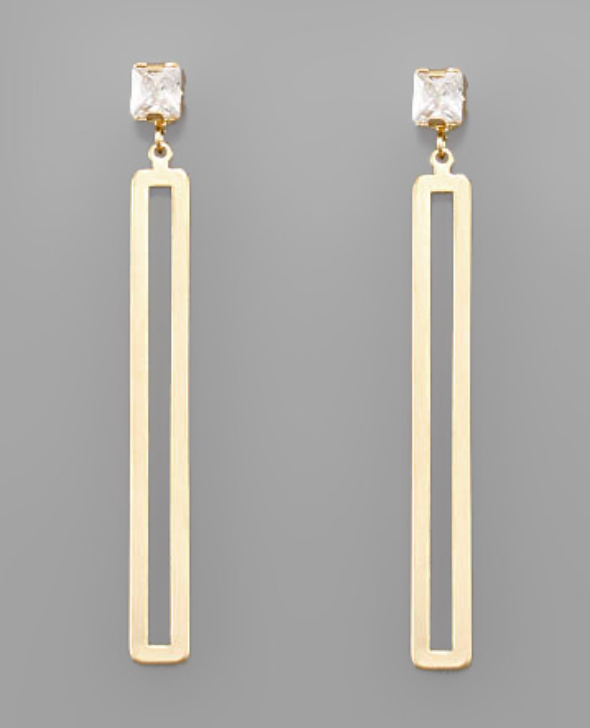 The Radiance Bar Earrings are sleek, modern, and effortlessly chic. Featuring a sparkling crystal stud paired with a long open gold bar drop, these 2.5" earrings create a striking silhouette that elongates the face. Lightweight yet bold, they bring just the right amount of shimmer and shine to elevate both casual and dressy looks.