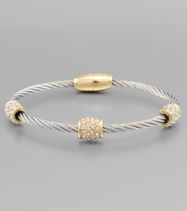 A modern twist on timeless elegance, this cable bracelet blends industrial edge with refined glamour. The twisted metal band—available in silver or gold tone—features three pavé crystal stations that shimmer with every move. A sleek magnetic clasp ensures a secure and effortless fit, making it perfect for everyday wear or a polished evening finish.
