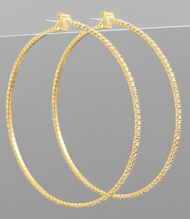 When subtle just won’t cut it—Rhinestone Hoop (60 MM) bring full-on sparkle with a sleek 2 ¾" silhouette and a rim of twinkling rhinestones. Set in a gold-toned finish, these oversized hoops are bold, light-catching, and totally unforgettable.
