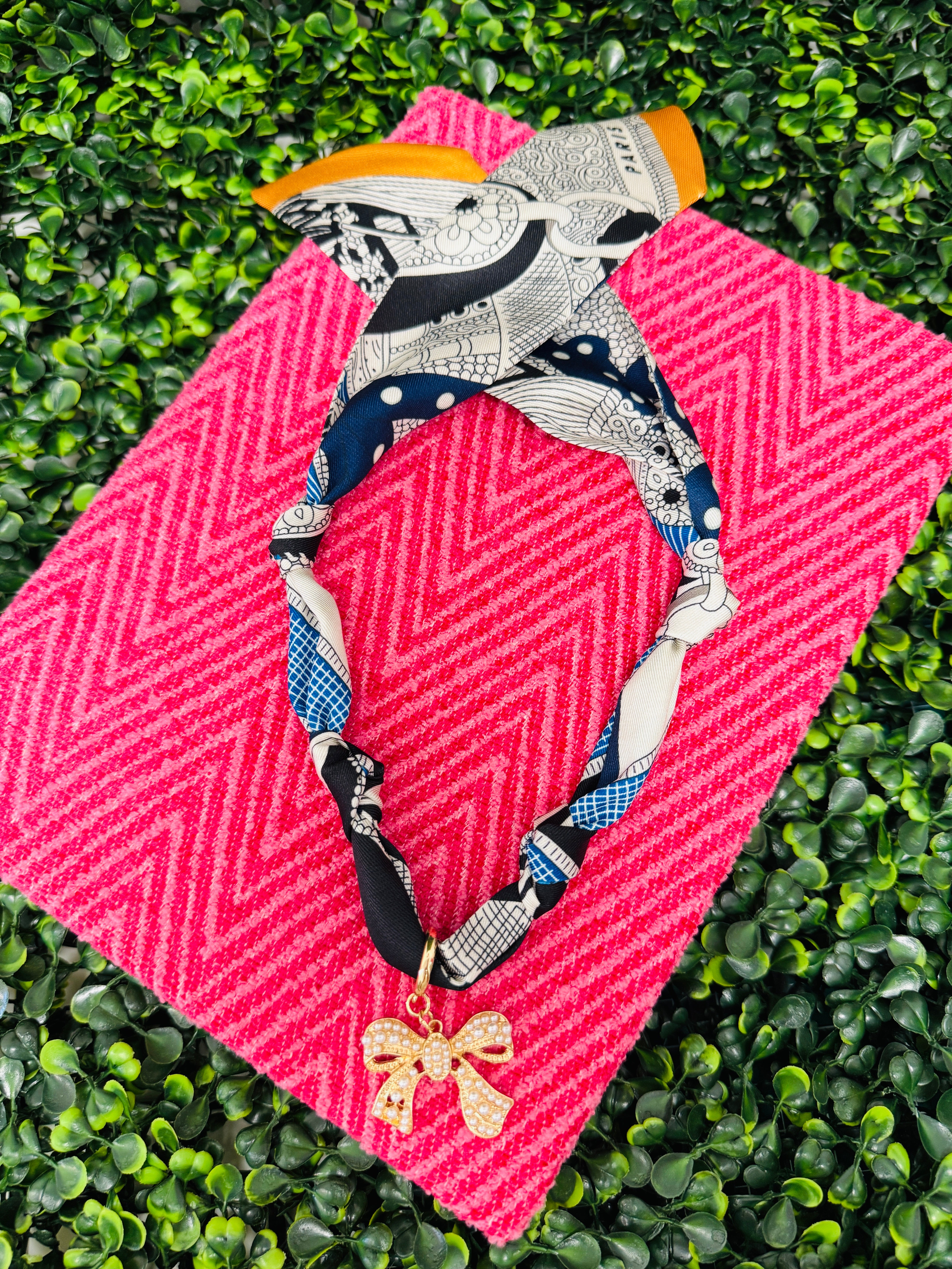 A dash of Parisian flair meets playful glam in the Ribbon Reverie Scarf Necklace. This silky black and ivory twilly scarf is intricately tied and adorned with a sparkling rhinestone bow charm—equal parts chic and charming. Whether you're feeling polished or playful, this beauty brings the drama.