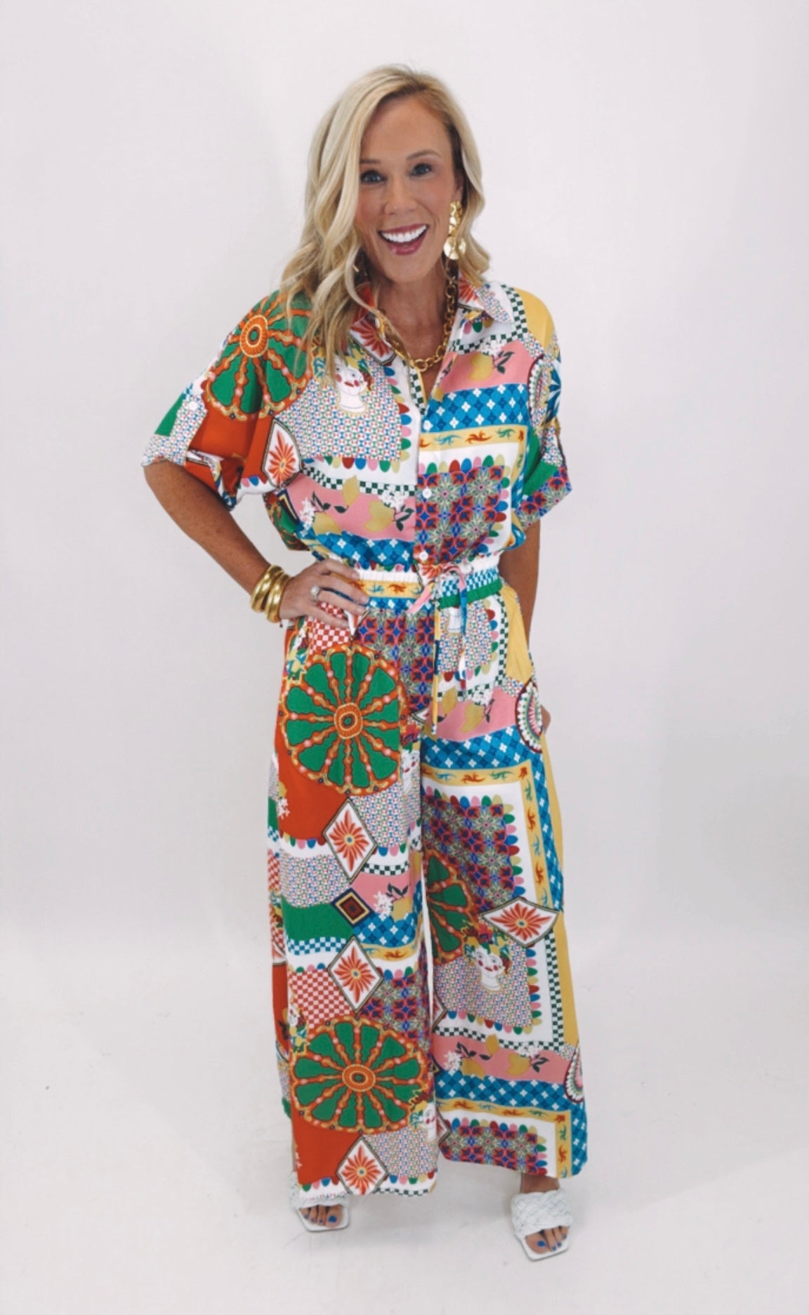 A jet-set vibe with a jolt of color! The Dolce Daze Set is a mood-boosting, statement-making duo featuring a button-up collared top and wide-leg pants with a comfy elastic waist. Worn together, it's an outfit that turns heads. Worn separately? Endless options. The vivid patchwork print and playful motifs give major Euro-vacation energy—no passport required.