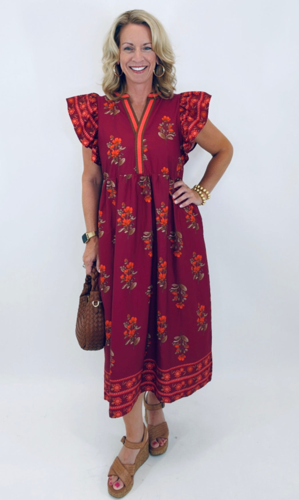 Let your style bloom in the Rustling Petals Dress! This deep red midi is sprinkled with fall-toned florals and finished with ruffled statement sleeves that bring all the drama (the good kind). The breezy fit and detailed trim neckline make it an effortless pick for day-to-dinner dressing. And yes, it has pockets—because why wouldn’t it?