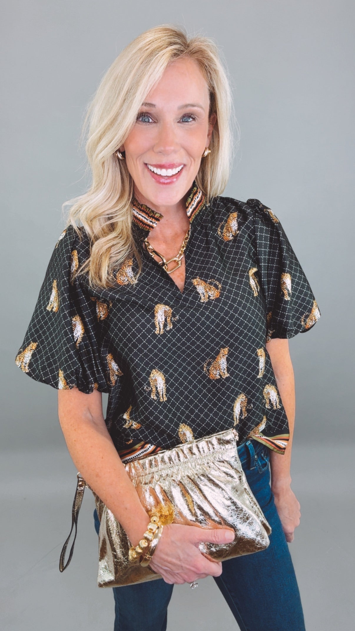 A chic statement blouse featuring a bold cheetah print set against a subtle grid pattern. The structured collar, short puff sleeves, and border trim detail bring an elevated twist to your everyday look. Lightweight and easy to style, it’s the perfect mix of playful and polished.