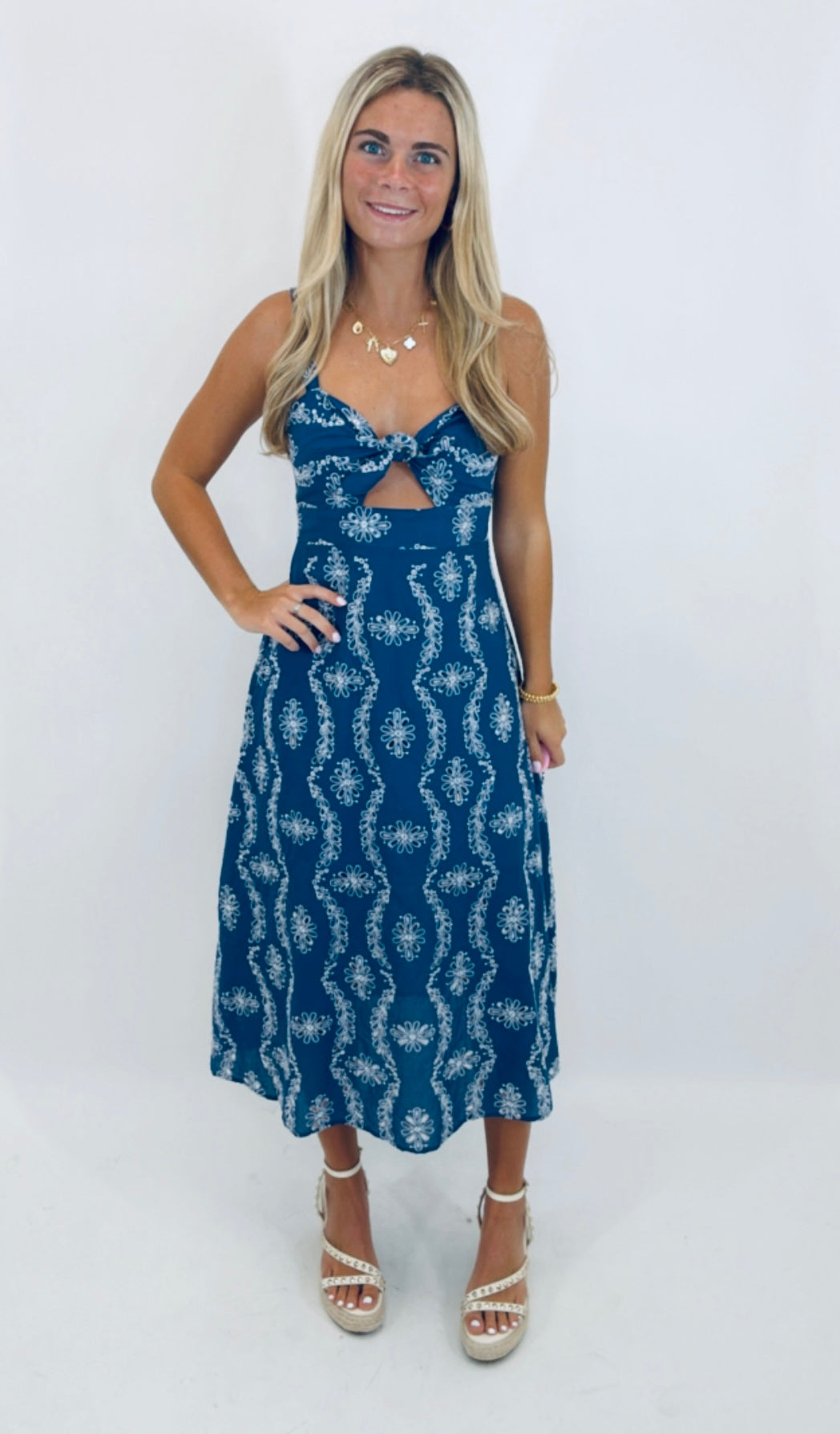 Stroll into style with this breezy midi dress, featuring a rich sapphire blue base kissed with delicate white floral scrollwork. The sweetheart neckline and charming tie-front detail give it a flirty, feminine touch, while the A-line skirt flows effortlessly for a universally flattering fit. Lightweight and easy to wear, it’s the kind of dress that makes every outing feel like a vacation.