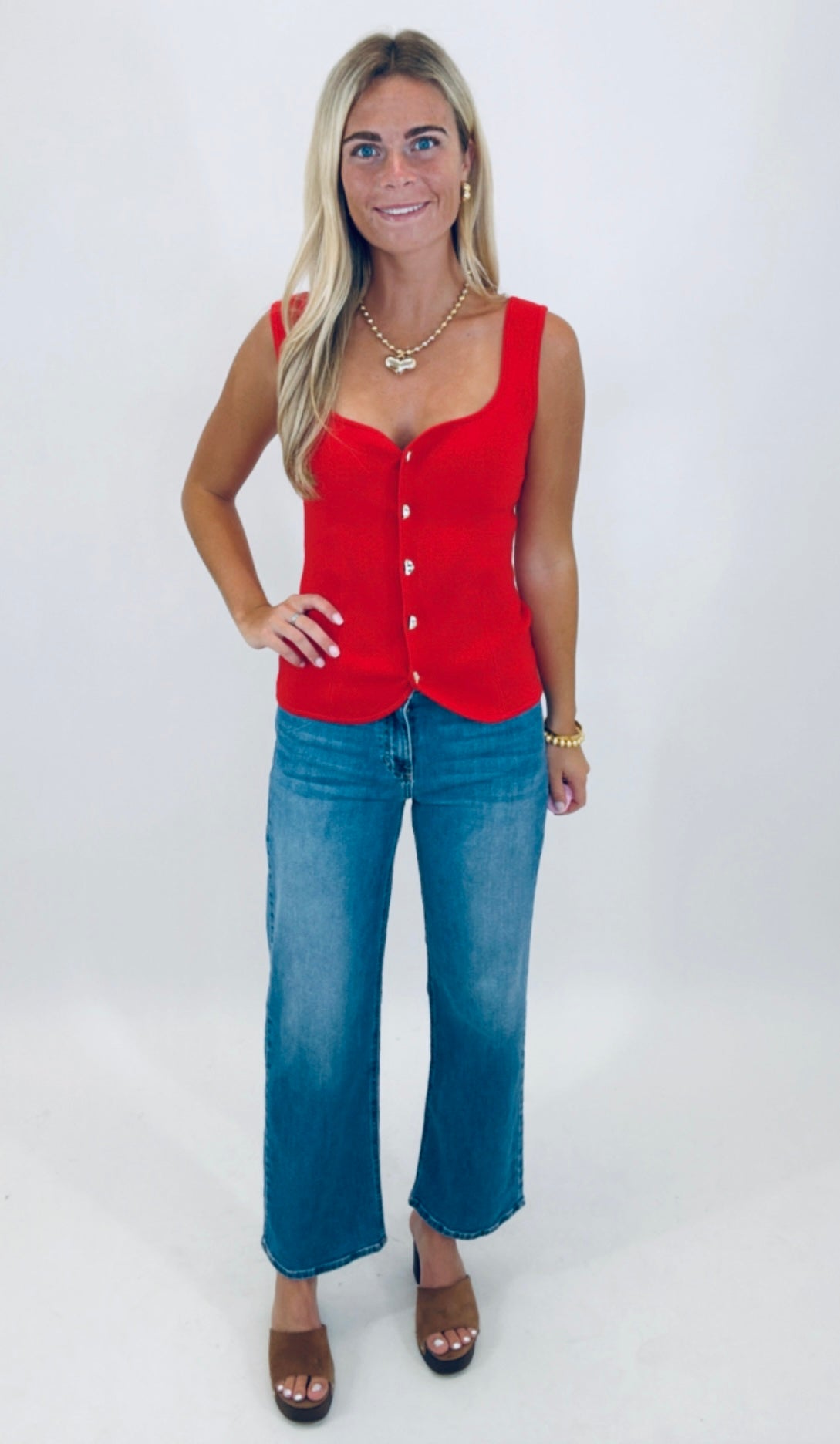 Turn heads in the Scarlet Muse Top, a structured knit tank with a sweetheart-inspired neckline and bold button-front detail. Its tailored fit and striking silhouette give off a polished yet playful vibe, making it the perfect piece to elevate your denim, skirts, or trousers.