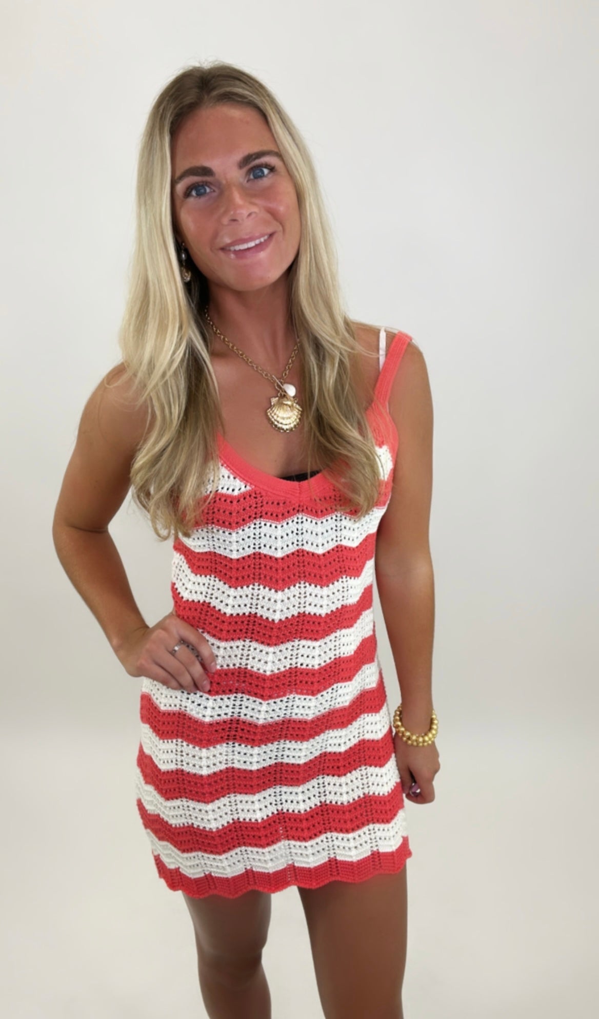 Turn heads from beach to boardwalk in our Scout Dress! This playful mini features bold coral and soft off-white stripes in a breezy crochet knit that’s as eye-catching as it is effortless. Unlined and made for layering, it’s perfect for tossing over your favorite bikini or bralette. With its flattering scoop neckline and flirty length, this is your new go-to for sunny escapes and salty air.