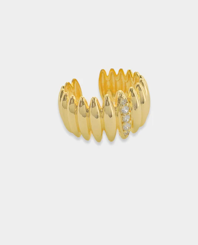 Bold meets refined in the Sculpted Shine Ring — a modern statement piece with sculptural texture and just the right touch of sparkle. The geometric ridges wrap around a row of radiant cubic zirconia, giving this gold-plated beauty depth and dimension. Adjustable for a perfect fit, it’s a chic addition to any ring stack or a standout all on its own.