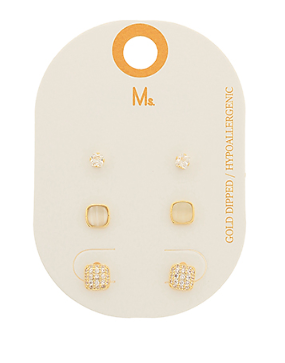Three pairs of timeless sparkle, one glam little card. This gold-dipped stud set includes classic crystal rounds, soft ivory-toned squares, and pavé-covered cushion studs—all hypoallergenic and sized between 1/8" and 1/4". Whether you're feeling subtle or statement, this set has your ear game covered.