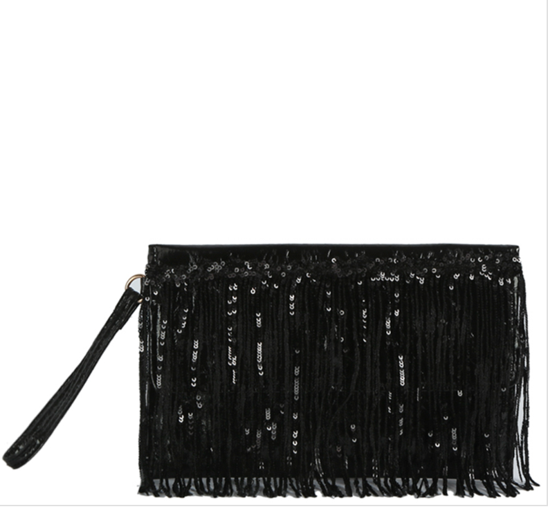 The Glimmer Fringe Clutch is your go-to piece for when the night calls for sparkle and movement. Measuring 9.8" L x 0.5" W x 6" H, it’s the perfect size to hold your essentials while keeping your look effortlessly chic. Adorned with cascading sequin fringe that catches every glint of light, this clutch is equal parts glam and playful. Its sleek silhouette and detachable wrist strap make it as functional as it is fabulous — perfect for dancing the night away or elevating any evening ensemble.