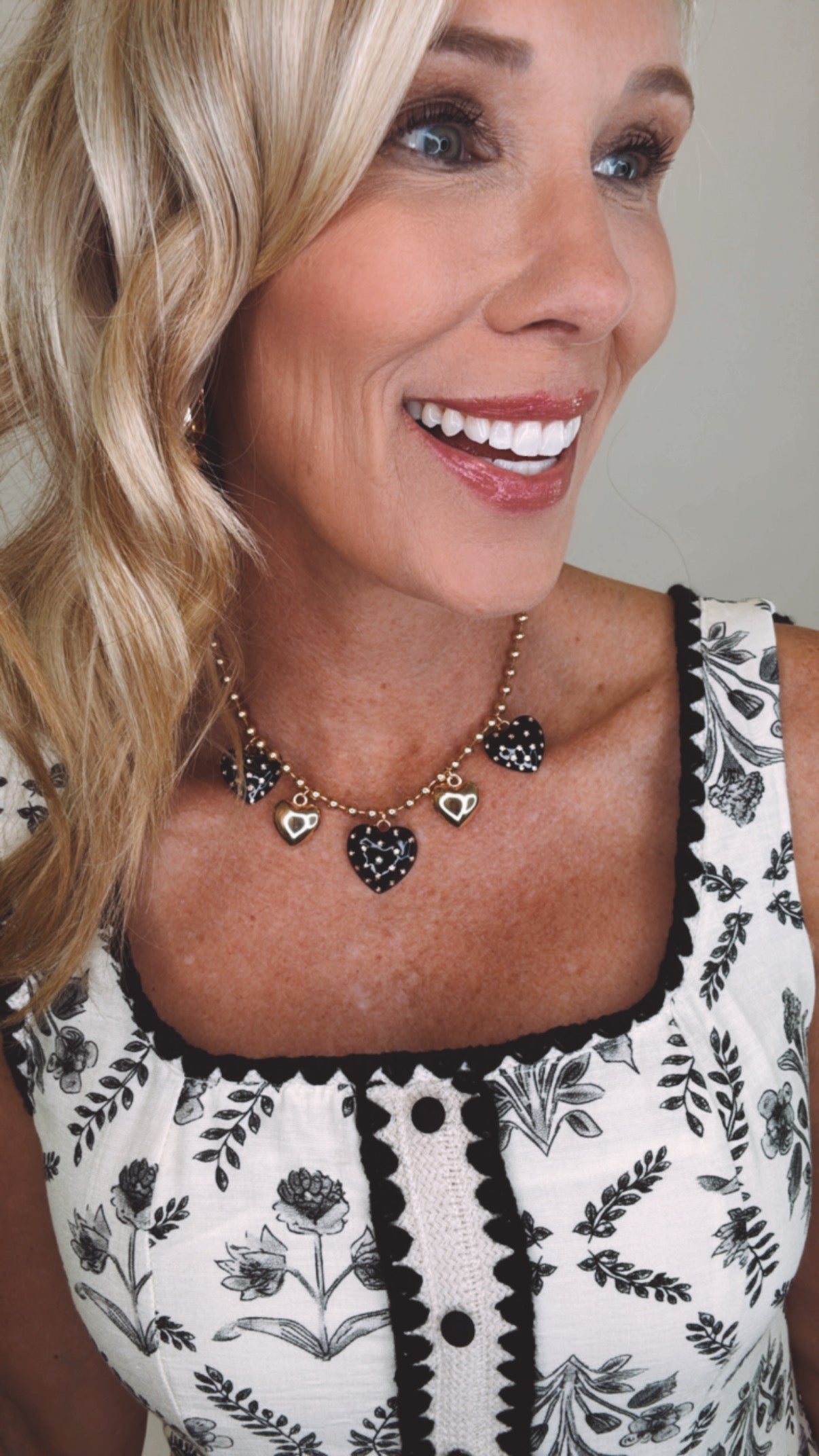 A dreamy blend of romance and celestial sparkle. This 16" + 3" necklace features a playful mix of glossy black hearts dotted with tiny golden stars, paired with polished gold-tone hearts for contrast. The beaded chain adds a chic, modern touch, making it a standout accessory.