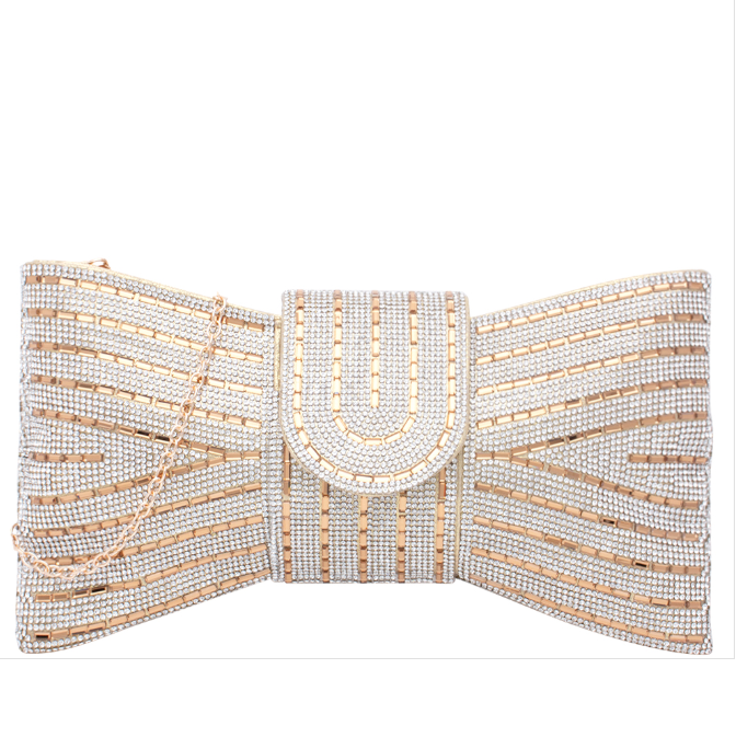 Make an entrance with this dazzling bow-shaped clutch, dripping in gold and silver beaded detail. Its geometric lines catch the light with every move, making it the ultimate statement piece for weddings, galas, or a girls’ night out. Designed with a secure flap closure and roomy enough for your evening essentials, this clutch strikes the perfect balance of glam and function. Includes a detachable chain strap so you can wear it hands-free as a crossbody or carry it chicly as a clutch. Approx. 11" x 1" x 6".