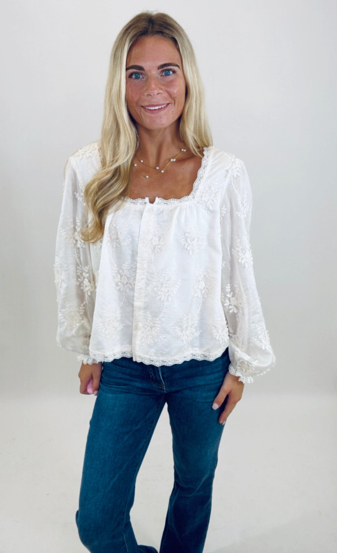 The Sweet Magnolia Blouse is effortlessly romantic with its embroidered floral details, delicate lace trim, and airy sheer sleeves. Designed with a flattering square neckline and button-front closure, this top blends vintage charm with modern versatility. It’s the perfect blouse for elevating your everyday look while still feeling relaxed and feminine.