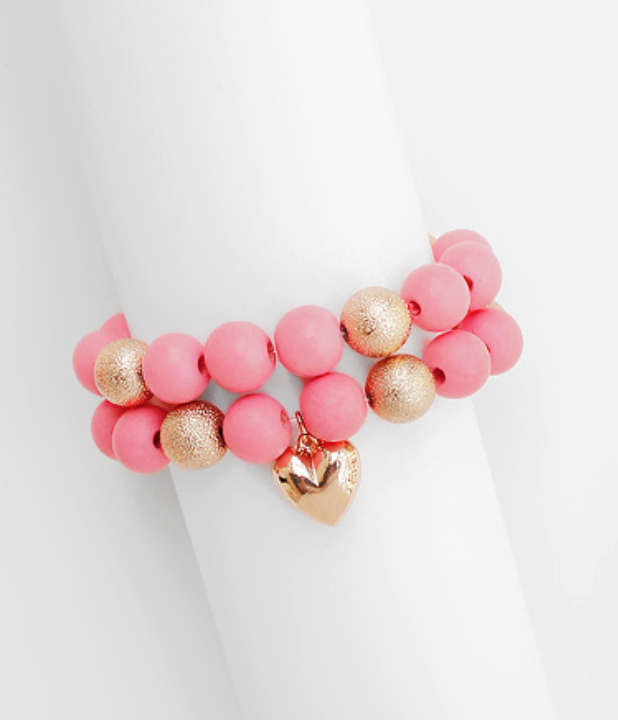 A playful pop of pink with a touch of shine, the Sweetheart Stack Bracelet is all about easy charm. This stretchy double-strand bracelet features soft matte pink beads mixed with textured metallic accents, finished with a polished heart charm that adds just the right amount of sweetness. Lightweight, comfortable, and effortlessly cute, it’s perfect for stacking or wearing solo when you want a little love on your wrist.