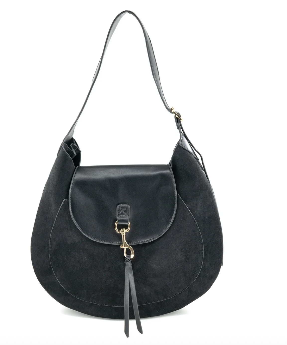 The Sloan Hobo is where effortless style meets everyday function. Crafted in luxe black suede with smooth leather accents, this chic shoulder bag features a curved silhouette, flap closure, and gold-tone hardware with a leather tassel detail. Spacious enough for your daily essentials but sleek enough for any occasion, it’s the ultimate wear-anywhere bag.
