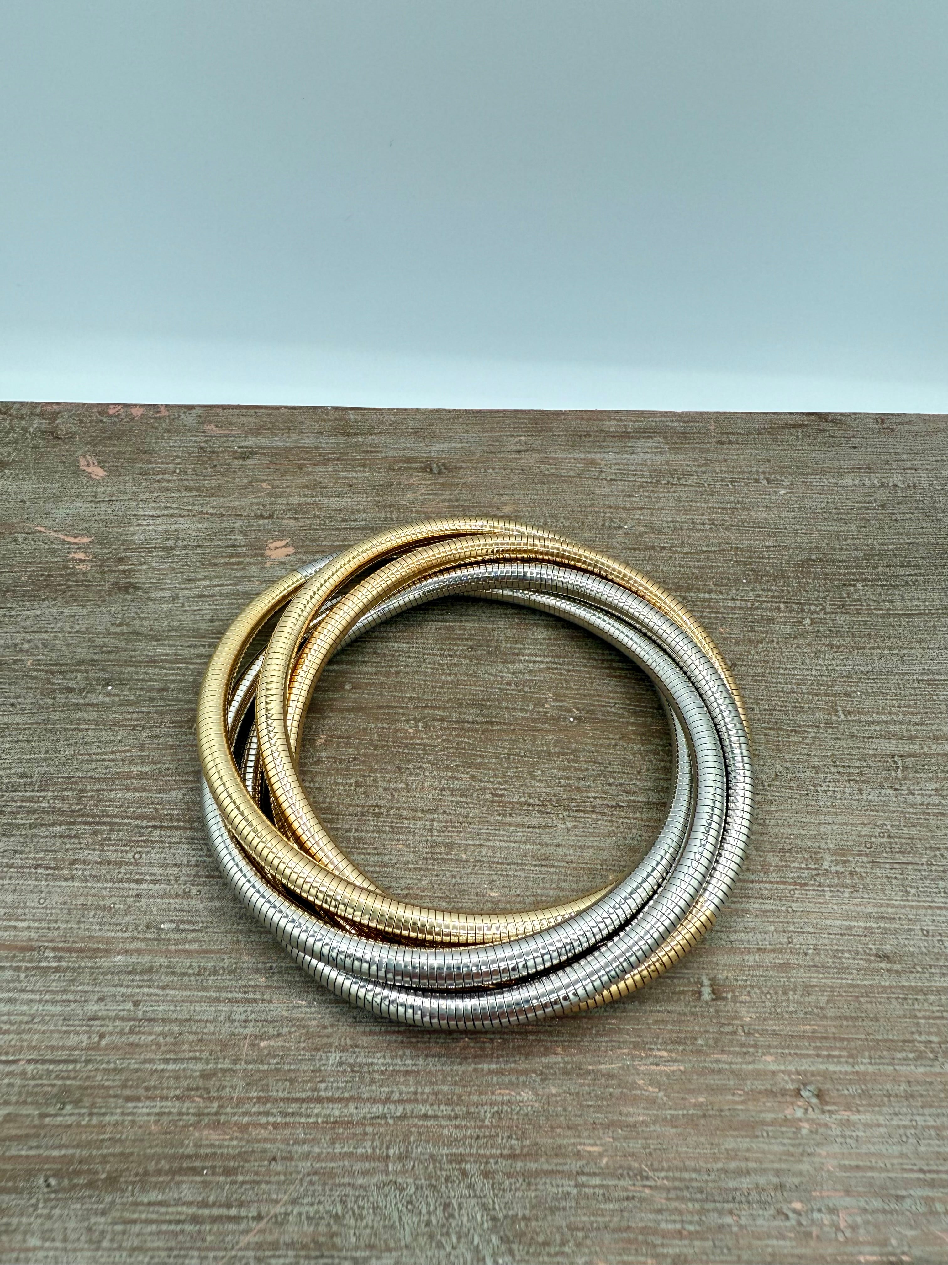 Meet your new go-to accessory for every occasion — The Social Stack. This set of five mixed-metal bangles is effortlessly chic, featuring both gold and silver tones that complement any look. The flexible, coiled design gives a touch of movement and comfort while the water-resistant finish ensures long-lasting shine. Equal parts modern and timeless, these bangles elevate every outfit — from denim days to dress-up nights.