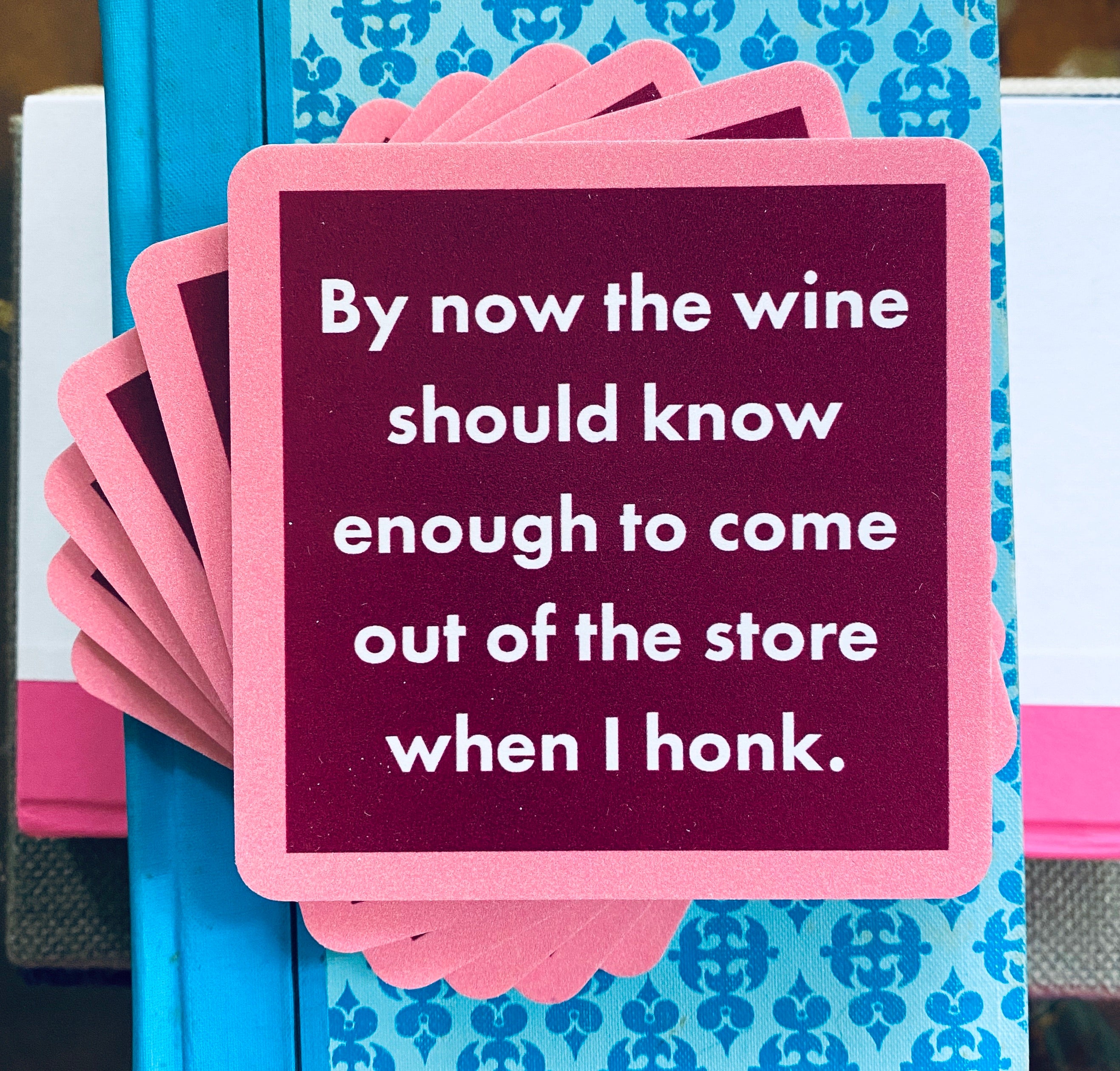 REUSABLE Coasters are 4”x 4” resin with cork backing and round corners. Sold individually.  BUY 4 or more of the same or assorted coasters & they come with a cute rubber band!  AMAZING hostess gift or funny gift for any & every day!!! Made in the USA.