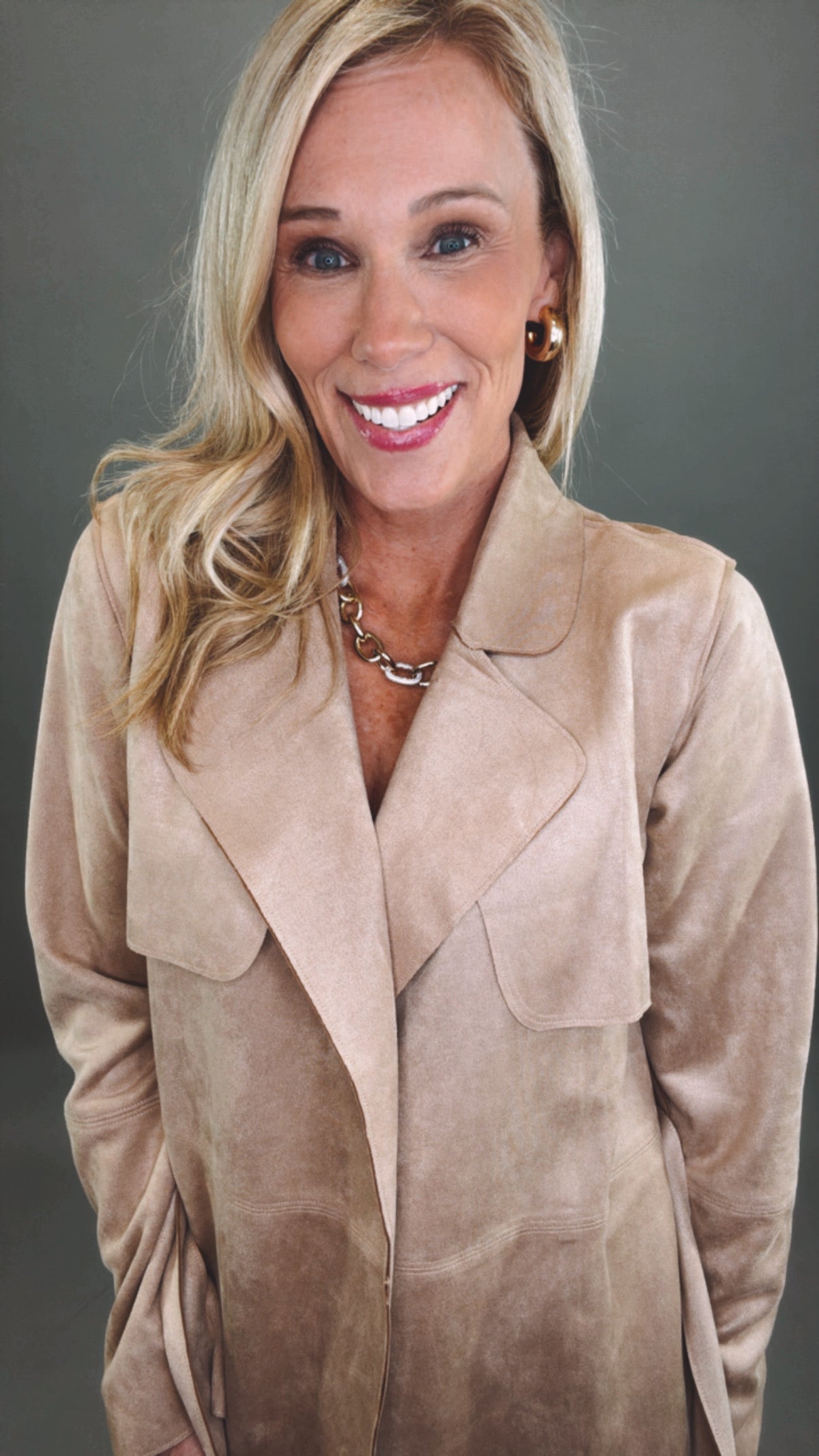 The Timeless Edge Trench Coat redefines classic outerwear with its luxe suede-like texture and modern silhouette. Featuring a flattering tie waist, soft draped lapels, and clean lines, this coat offers both polish and ease. It’s the ultimate layer for effortlessly elevating any outfit—from denim days to evening outings.