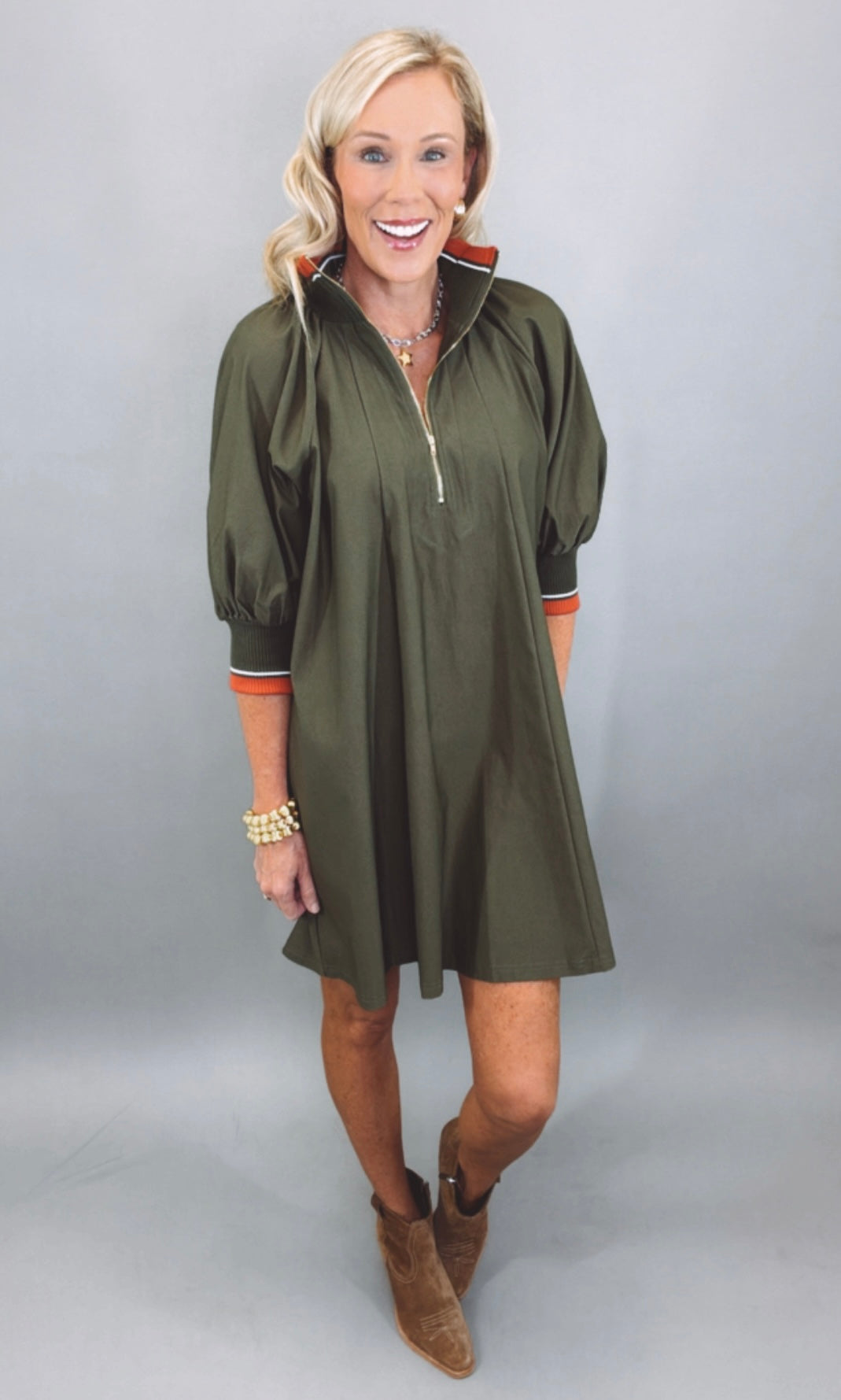 Effortlessly cool with a touch of sporty edge, this olive mini dress brings casual sophistication to any day. Designed with a relaxed A-line silhouette, it features puffed half sleeves and a front zip neckline for a modern twist. The ribbed knit collar and cuffs pop with red and white stripe detail, giving it that elevated athleisure vibe. Lightweight yet structured, it drapes beautifully for a flattering, easy fit.