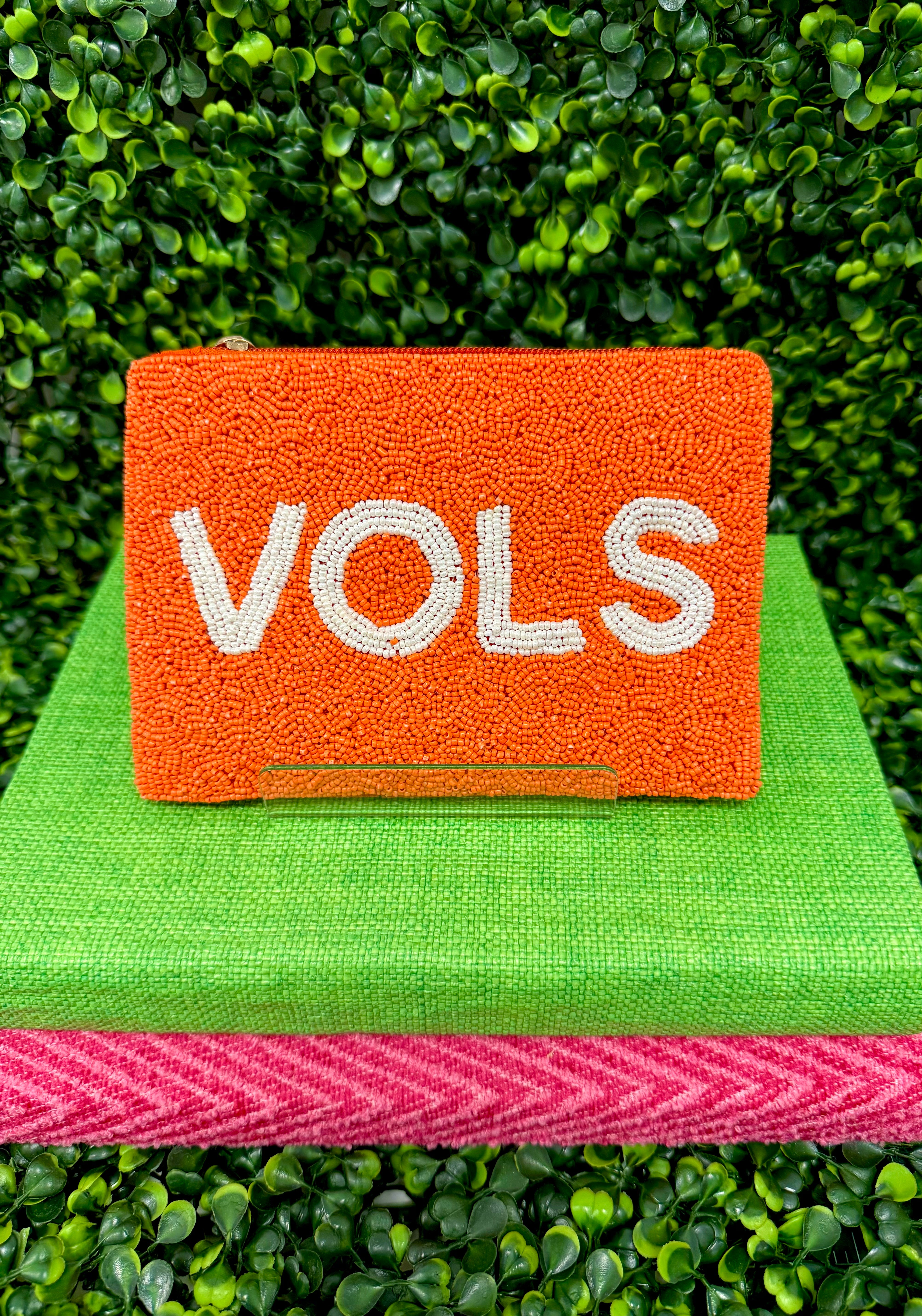 Show your Tennessee Vols spirit in style with this orange-and-white hand-beaded pouch. Measuring 4.25" x 6", it’s the perfect size for game-day essentials like your phone, keys, and lip gloss. Lightweight yet eye-catching, this Vols beaded bag is the ultimate accessory for cheering on Tennessee football, basketball, and beyond.