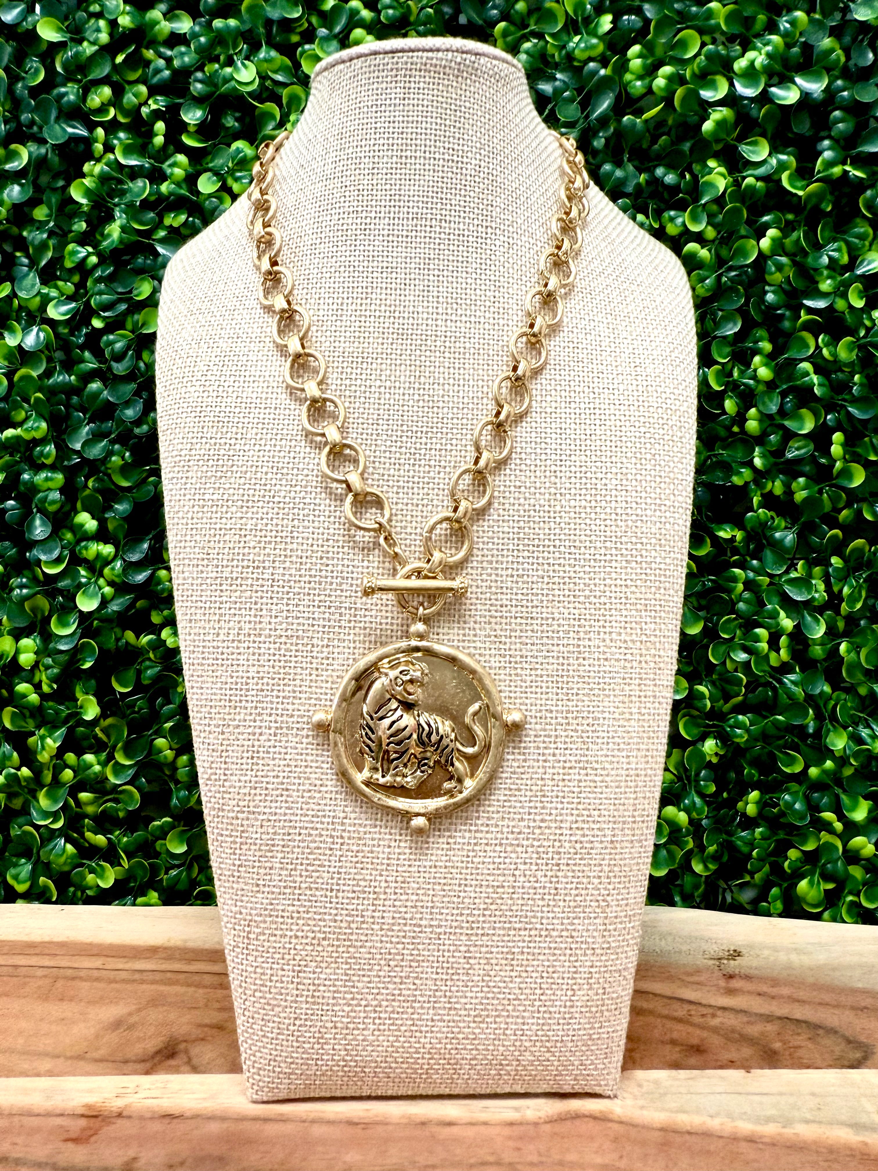 Stride into your bold era with the Wild Walk Necklace—featuring a detailed tiger in motion on a textured gold-tone medallion. Suspended from a chunky 16" link chain with a front toggle clasp, this necklace brings fierce elegance and fearless energy to your neckline.