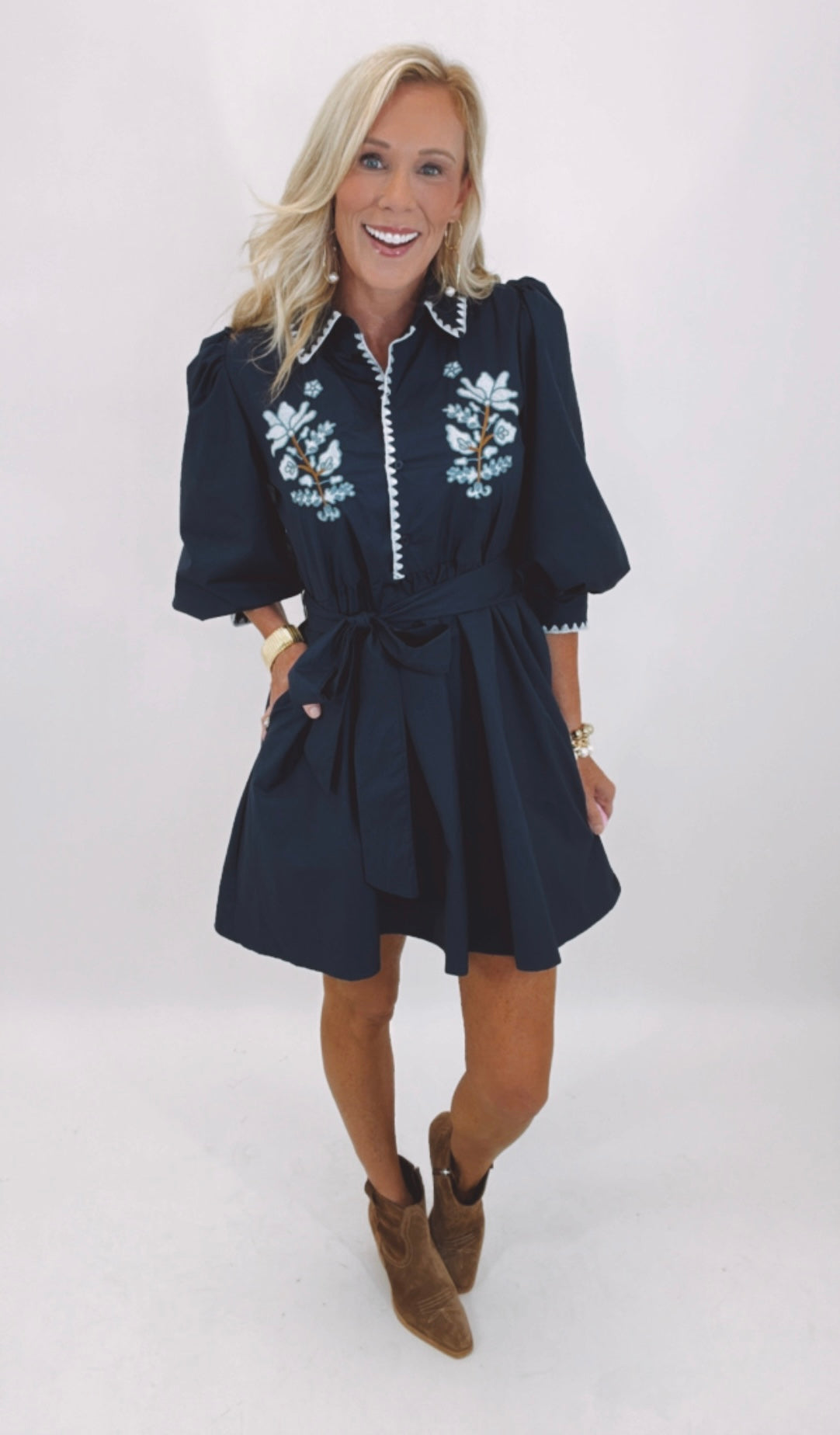 The Willow Lane Dress blends timeless charm with modern femininity. Featuring puff sleeves, delicate embroidery along the bodice, and a flattering belted waist, this shirt-dress silhouette brings both structure and softness. The button-down front and collared neckline give it a polished finish, while the flowy skirt keeps it effortlessly chic. It’s the perfect piece for brunch, garden parties, or an elevated everyday look.