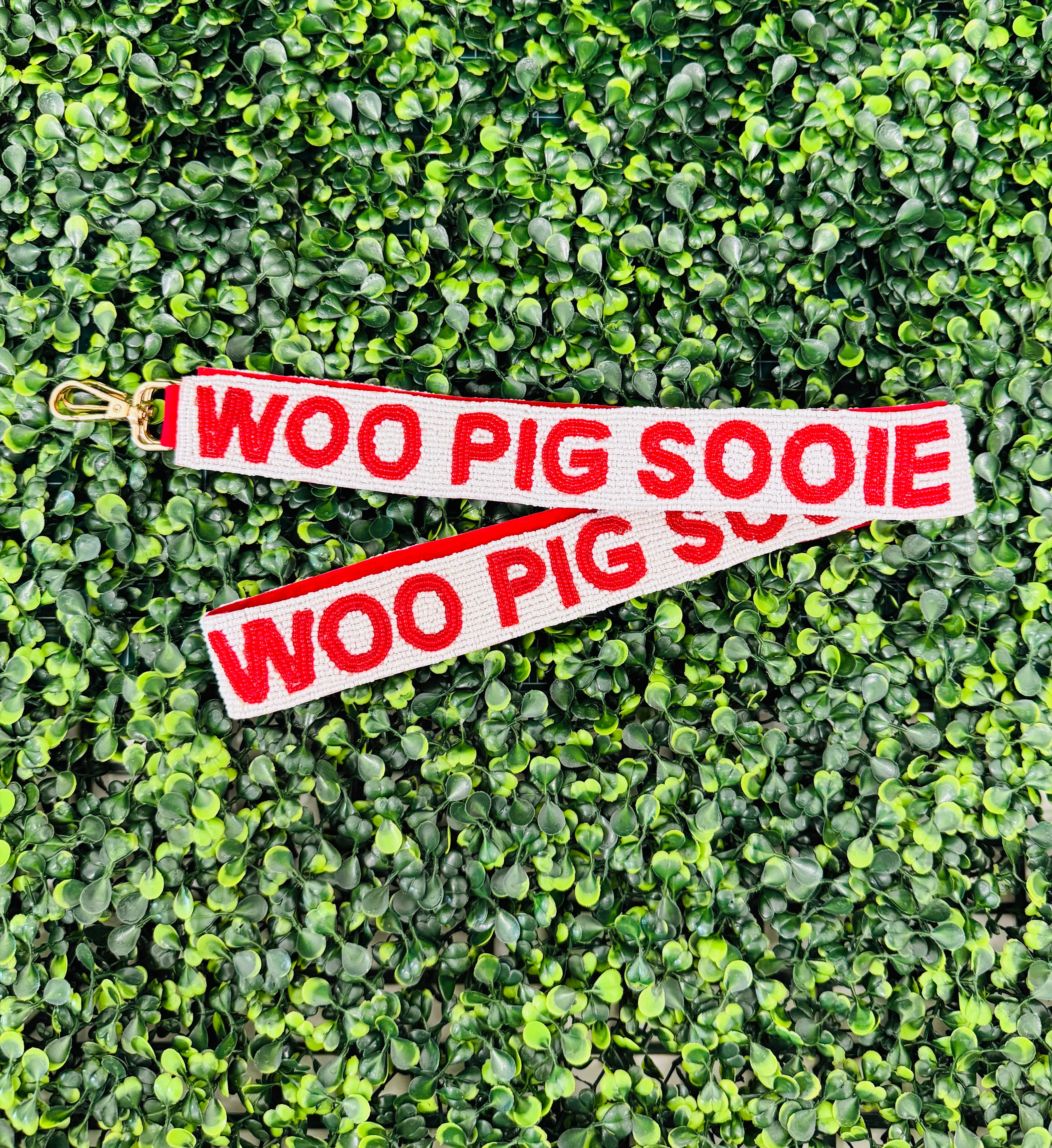Call the Hogs in style with the Woo Pig Glam Strap! This handmade beaded guitar strap features bold crimson lettering on a pearl-white background, giving Razorback pride a seriously chic upgrade. With luxe gold hardware and plenty of sparkle, it’s the perfect accessory to clip onto your clear stadium bag, everyday tote, or gameday crossbody.